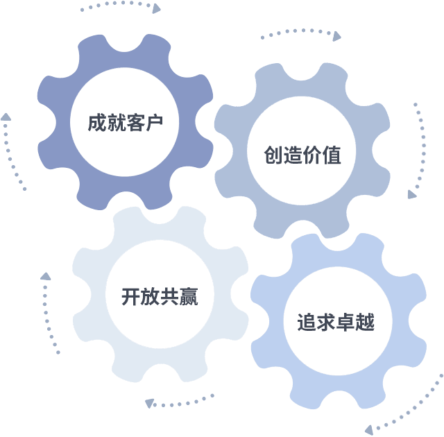 成就客户是一切决策的出发点,,,,创造价值是衡量所有工作的标准,,,,追求卓越是我们做事做人的态度,,,,开放共赢是我们的格局也是最终的结果。。。。价值观的齿轮环环相扣,,,,推动着组织里的每个人不断向前。。
