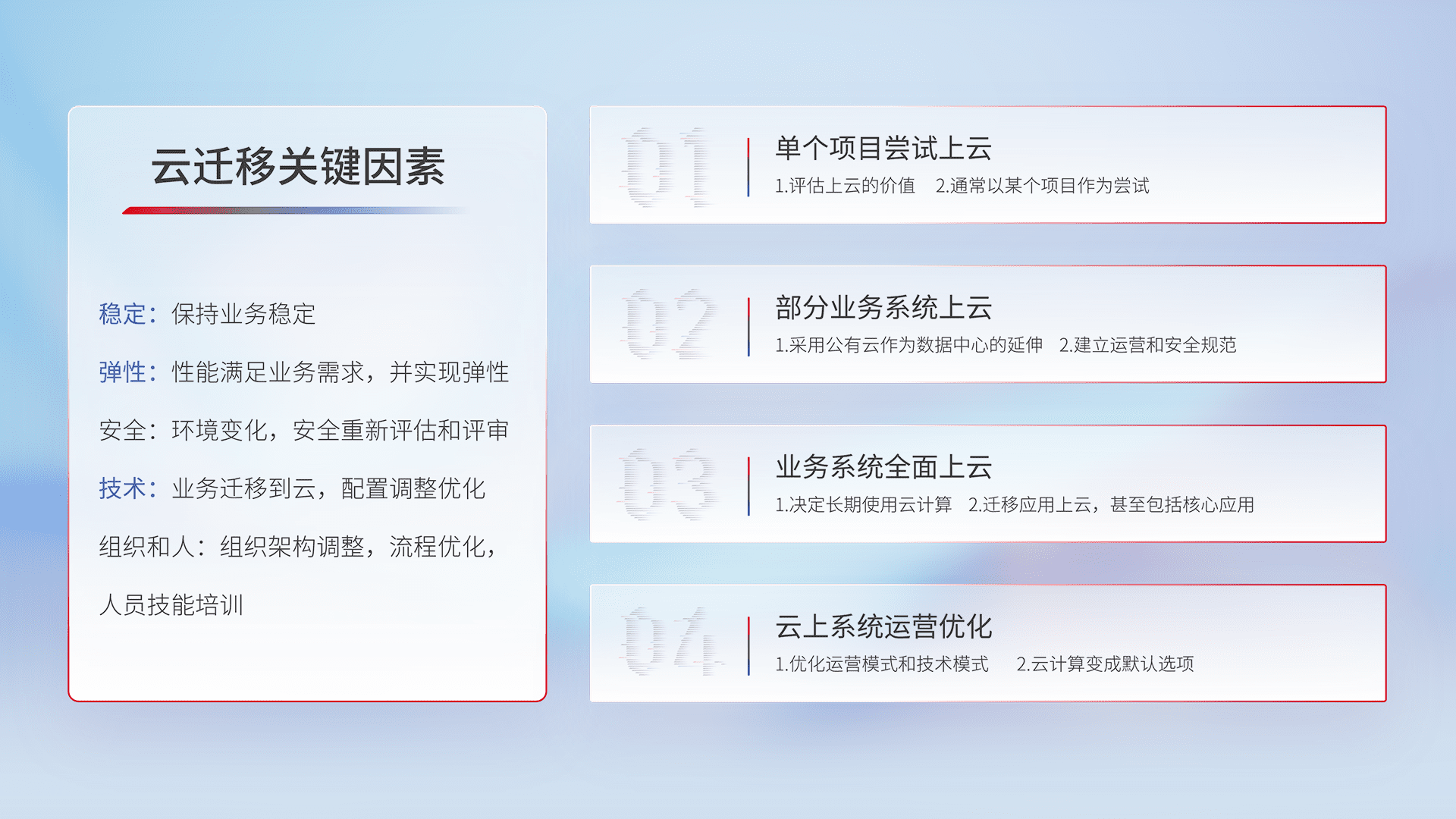 结合实际业务,,,从规划设计、、、云平台选型、、、、云原生改造、、、、数据迁移、、集成交付,,,,迁移全过程为客户识别最佳上云路径,,做好风险识别管理,,,设计网络架构、、、身份权限、、、安全审计合规、、操作审计、、、日志审计、、、、监控告警策略、、、多站点容灾设计等,,,对云上基础设施进行整体规划,,,提升IT治理水平,,以满足弹性、、、高可用、、、高性能的需求。。。