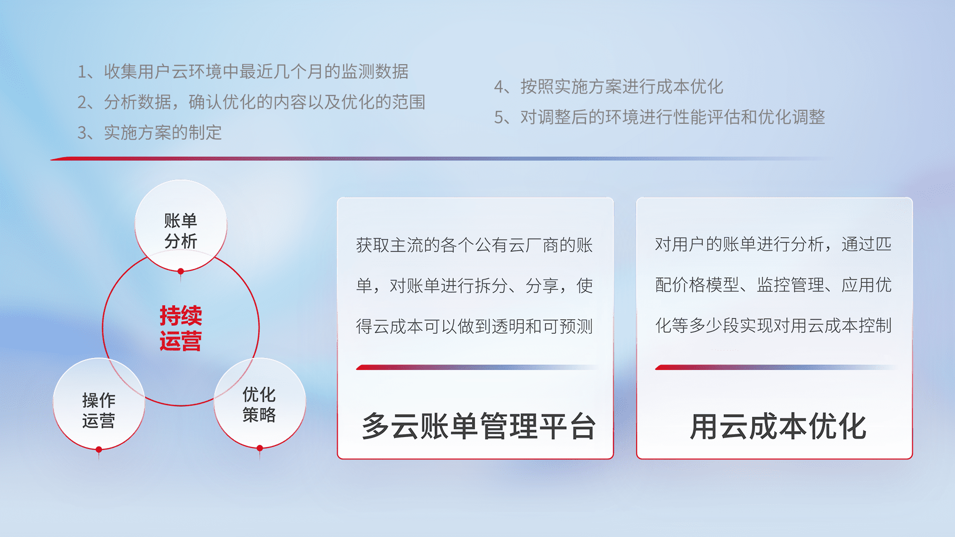 通过多云纳管,,以统一的资源数据模型把客户的云资源进行抽象和封装,,,进而实现对多云资源的统一操作,,,,保障云资源管理的可靠性、、、、稳定性与可用性。。。量身定制化运维内容,,配置、、开发运维、、、、补丁管理、、、备份、、、监控、、、、认证和访问管理、、、、审计和日常巡检等,,保障在用云过程中的可靠度,,,稳定度以及高可用率。。。